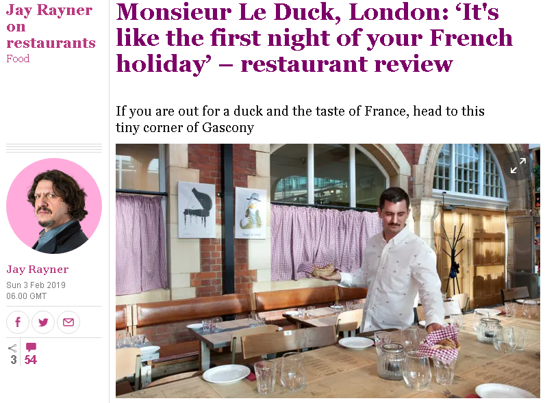 The result is “delightful in a low-key, sweetly romantic way”; the “narrow frame they’ve set for themselves” (of serving just a few duck dishes, plus a vegetarian option which “represents perfectly a Gallic shrug of disdain for non-meat eaters”) works, thanks to the competence of the cooking.