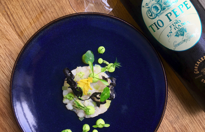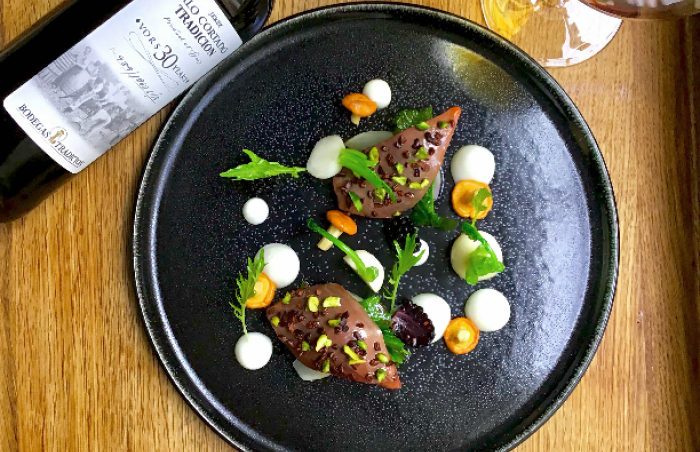 To begin, Texture presented scallops with avocado, cucumber and wasabi, a dish the team paired with a magnum of Tio Pepe en rama. O’Dell and his brigade then served pan roasted pigeon with salt baked turnip, pickled blackberries and a sherry jus, which was accompanied by a glass of 30 year old (VORS) Palo Cortado from Bodegas Tradicion.