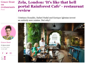 Grace Dent in The Guardian had an odd experience at the celebrity-backed Zela, newly opened in the ME hotel in Aldwych. Christiano Ronaldo, Rafael Nadal and Enrique Iglesias have chucked “so much money at a restaurant that they claim to have invented an entirely new cuisine” – ‘Meppon’ – apparently “an exquisite, original fusion of the best Mediterranean produce with Japanese techniques”.