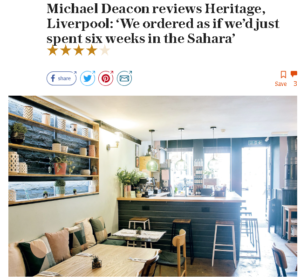Michael Deacon in The Telegraph ate at small-plates restaurant Heritage in Liverpool, where he “ordered as if we’d just spent six weeks in the Sahara”. (****1/2)