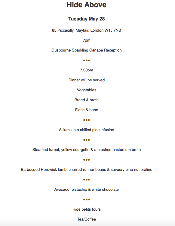 The evening will commence on the first floor in Hide Above, with a Gusbourne canapé reception followed by a 4-course menu with paired wines, designed for the night by Ollie and Hedonism Wines. Enjoy a delectable feast including “flesh & bone”, alliums in a chilled pine infusion, steamed turbot, yellow courgette and a crushed nasturtium broth, barbecued Herdwick lamb, charred runner beans and savoury pine nut praline all washed down with a wine pairing carefully selected by Hedonism.