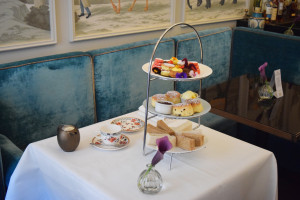 The menu includes: Danelion, Burdock & Honey Seared Salmon with Pickled Cucumber; Orange Blossom Infused Cream Cheese & Smoked Duck Crostini; Elderflower and Blue Cheese Doughnut; Raspberry, Rose & Lychee Macarons; Honey Bee Financiers and Violet Scented Eclairs sit alongside classic scones with jam and clotted cream.