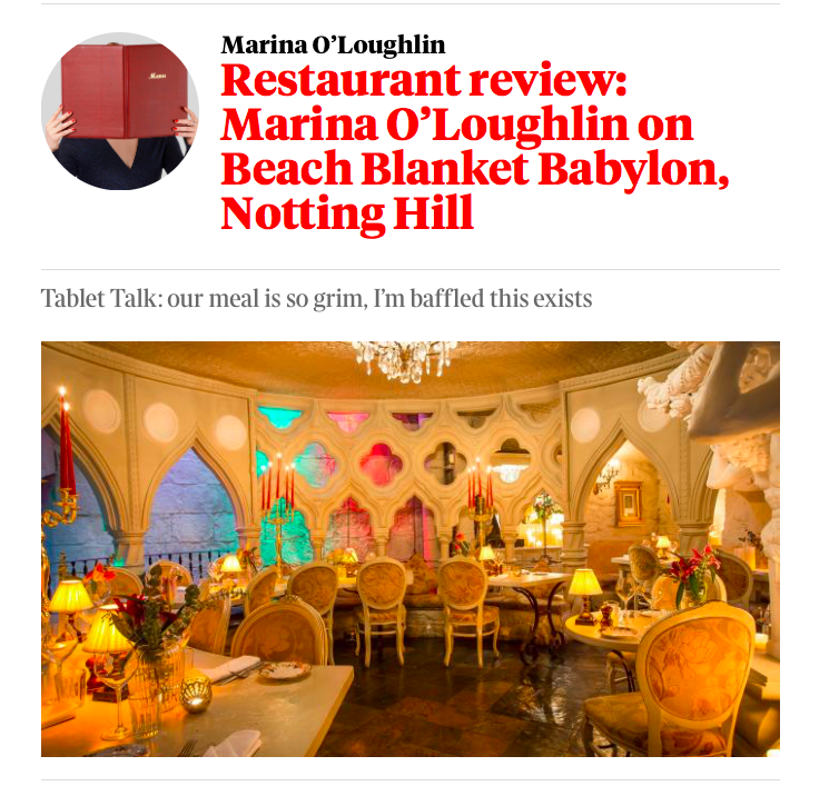 Marina O’Laughlin in The Sunday Times is baffled by the existence of Beach Blanket Babylon in Notting Hill (as are we all). The venture, with sites in W11 and Shoreditch, has never scored above a 1/5 for food in our survey and has long since been dropped from the pages of the guide…