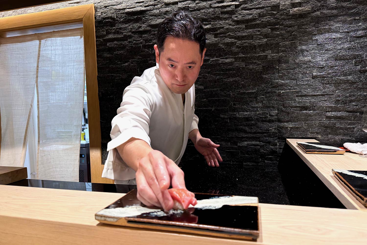 Shogo says he aims for a warmer ambience than is sometimes found in traditional Japanese venues: “Being from Fukuoka, my approach differs from the more formal atmosphere often associated with Tokoyo sushi counters.”