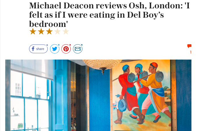 Michael Deacon in The Telegraph feels “as if I were eating in Del Boy’s bedroom” at Knightsbridge newcomer Osh, which fuses traditional Uzbek cuisine with international dishes…