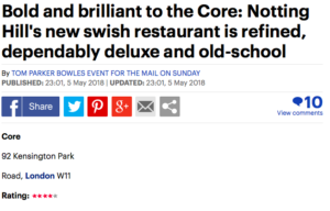 “This kitchen’s cooking is as tight as a Nashville backing band. In a cursed site that hasn’t had a success since Prue Leith opened her eponymous place back at the fag end of the 1960s, I get the feeling that Core is here to stay… flavours dance between the subtle and the sensational… up there with the best in town. Reassuringly refined, dependably deluxe.”