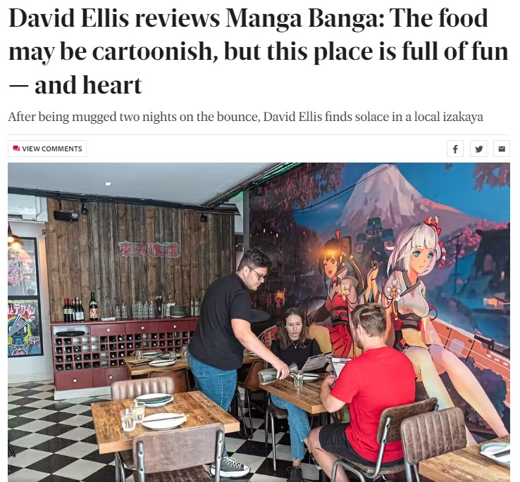 After being mugged two nights in a row, in Corfu and London, David Ellis sought comfort, fun and solace at Manga Banga, the newly opened izakaya in Marylebone, which he describes as “a full-blown, fill-the-stomach-up gaff, one for a few beers and a decent bite and heading out into the night”.