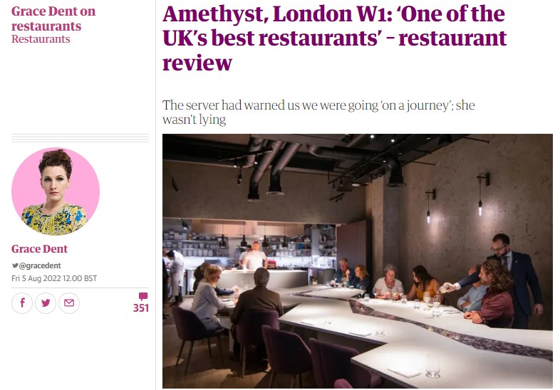 After “10 nights of eating out simply, yet satisfyingly, in south-west France” Grace Dent went to Amethyst, where “Carlo Scotto… has quietly and painstakingly revealed himself over the past few years as one of Britain’s most imaginative chefs”.