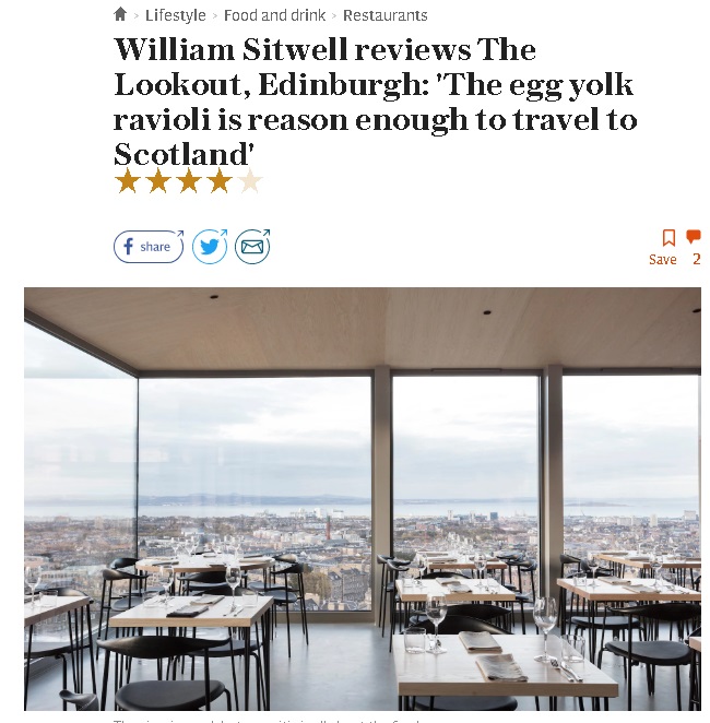 William Sitwell for The Telegraph was also in Edinburgh, “on the top of Calton Hill”, at a new restaurant that’s “part of an ambitious and bold development called The Collective”. Two of the windows in the “beige and glass box” are “designed so you can’t see the ground outside and feel like you’re floating above the city”.