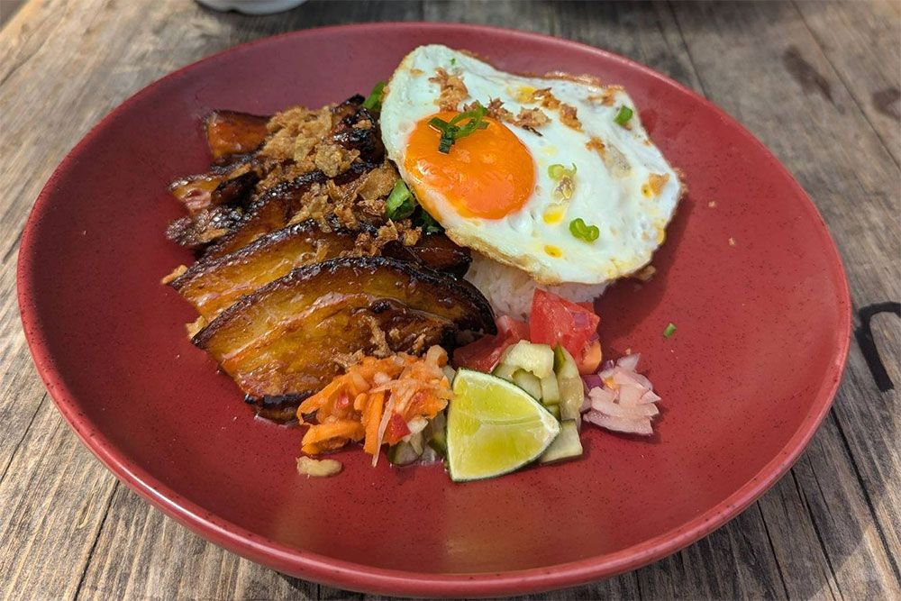 Dishes include: Oxtail kare kare croquettes with peanut sauce and ensaladang talong; four-hour braised pork Ticino rice bowl; Beef longganisa sausage sandwich with yoghurt and sriracha; Prawn ginataan, in a spiced coconut sauce, and Royal bibingka dessert, a sweet rick cake with melted cheddar choose and villa ice cream.