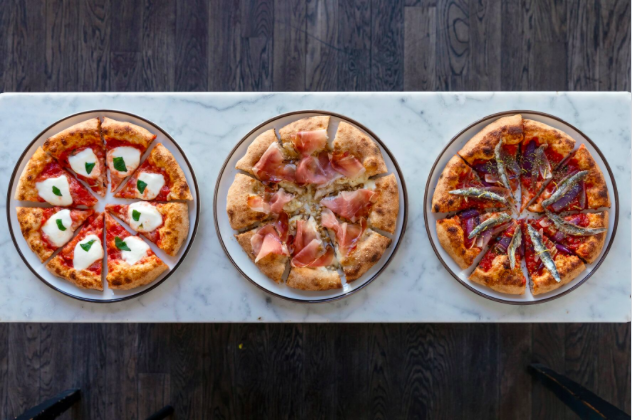 The Bologna-born brothers have developed a sourdough base they ferment at room temperature for 24 hours, cook, and then divide into eight slices to which they add organic toppings such as anchovies, lemon zest, red onion and tomato; gorgonzola, honey, speck, fiordilatte and walnuts; or prosciutto di Parma, burrata and orange-fused oil.