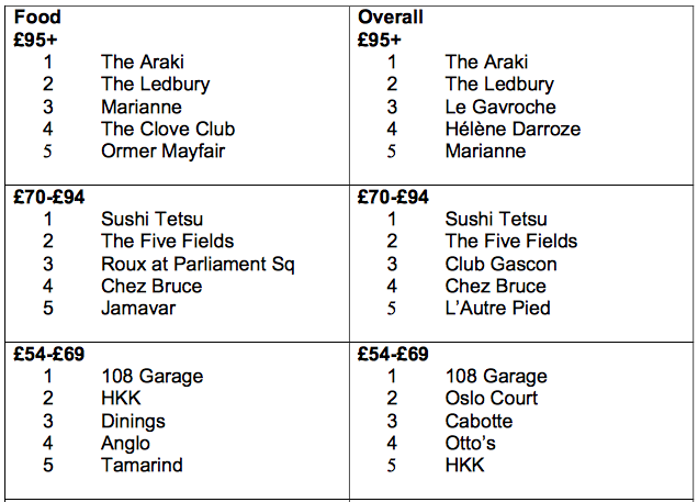 Survey results, based on average marks awarded for food, service, ambience