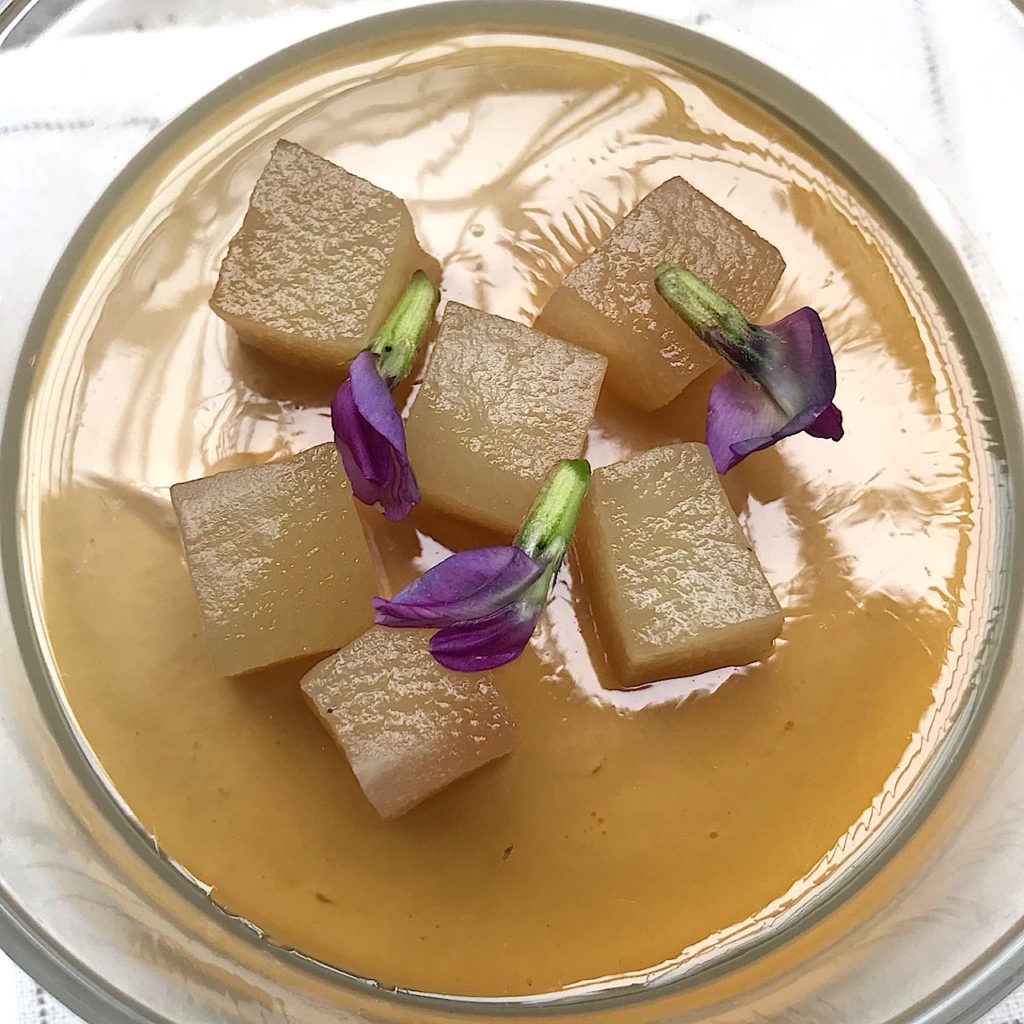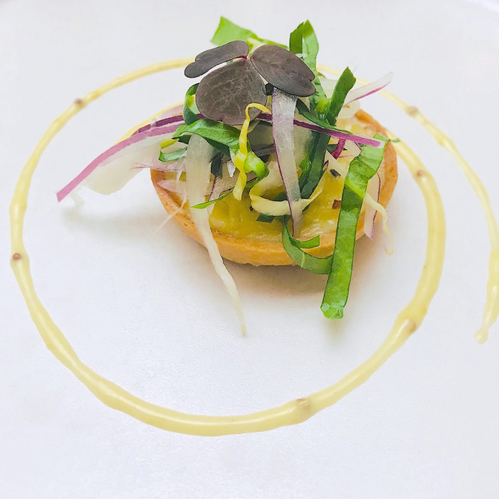 — Warm onion and Montgomery cheddar tart with cider and sorrel