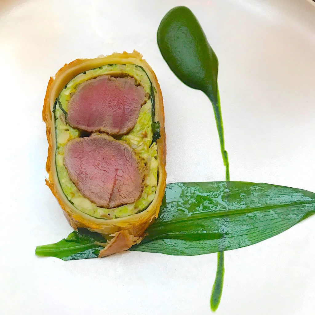 — Muntjac Wellington with wild garlic sprouting broccoli and Jersey Royals