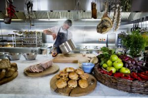 ” Definitely something to perk us up. Fluttering pink silk hankies peel off cured Tamworth pork. Herdwick lamb and smoked eel may never have met before… but they get on brilliantly… crisp, snappy skin and lush flavourful interior, this is the best lamb I have eaten in years. Soft and waxy cheeses accompanied by smoked potatoes and walnuts are visited by a charred spring onion with its roots still sprouting looking like the mad guest at a party.”