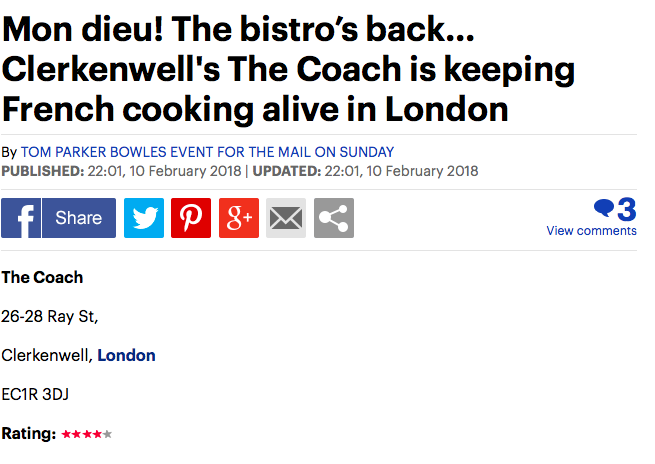 Tom Parker Bowles in The Daily Mail finds ‘bourgeois French food at its best (up there with Racine)’ during his lunch at Henry Harris’s latest London venture the Coach, Clerkenwell. High praise indeed…