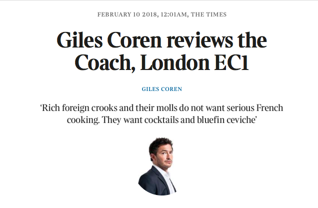 You’ll need a Times subscription if you want to read Giles Coren’s impresh of the Coach in The Times. Here’s a little taster: