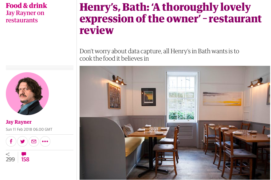 Jay Rayner in The Observer reviews Henry’s, Bath, and gives his thoughts on the restaurant ‘experience’ at a talk on data capture and personalisation, where he predicted the rise of the counter-revolution…