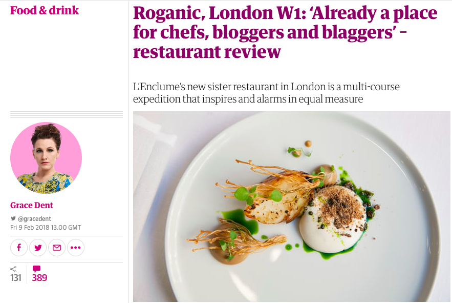 Grace Dent in The Guardian gives her thoughts on the second iteration of Simon Rogan’s Roganic which opened in Marylebone last month. They are mostly that few people actually want to spend their free time indulging in this sort ‘multi-course, Michelin-teasing, 50 Best-flirting dining’…