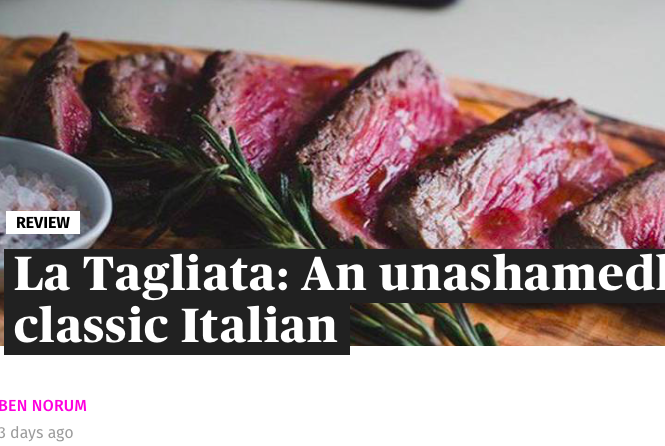 La Tagliata: “…specialising in typical Italian food and drinks, with produce and provenance in the limelight… consistently sits above the belissimo bar… exemplary carbonara made with guanciale (cured pig cheek)… classic tiramisu packing a serious espresso kick.