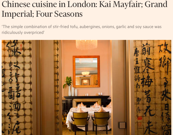 “The long-established Kai Mayfair has a menu that is well attuned to wealthy clientele. While the high prices could, I suppose, be justified for the lobster (£35) and the Oriental pork belly (£21), there must have been a huge mark-up on our ma-po aubergines at £26.