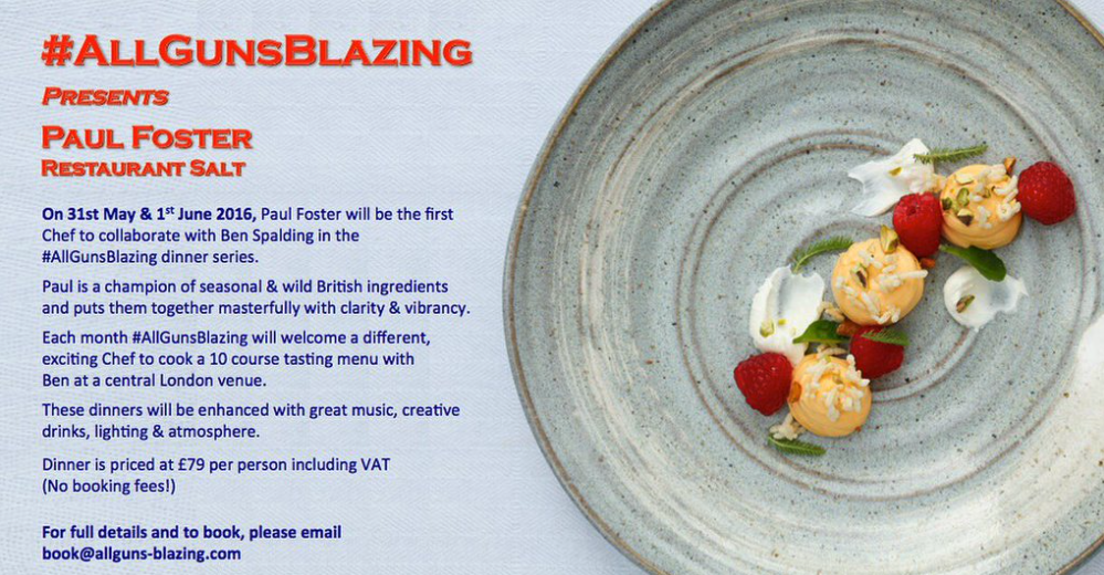 Chef Ben Spalding will launch a rather tasty sounding series of dinners next month with some big name chefs from around the world. #AllGunsBlazing starts on 31 May at 4th Floor studios on Commercial Road, Shoreditch. The line up sounds impressive: