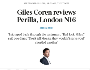 Back home, licking his wounds, he ventured to “unexpectedly fashionable” Stoke Newington and Perilla, and was delighted to find that it was “close to home, elegant, casual and beyond excellent”. The first two courses on the tasting menu “fair blew me away” with their beauty, soul and vision: ‘Yesterday’s bread soaked in moules marinière’ tasted “like the perfect last bite of all shellfish suppers”.