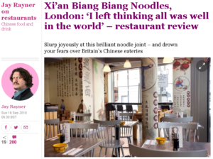 In The Guardian, Jay Rayner investigates the “extravagantly named” Xi’an Biang Biang Noodles in Spitalfields, part of the “glorious flowering in the variety of Chinese food available in Britain’s cities” as a result of the opening up of China.