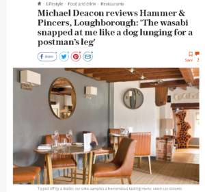 Micheal Deacon in The Telegraph recommends a visit to Loughborough pub The Hammer & Pincers for the grazing menu – itself recommended to him by a reader . Many more hits than misses, especially the pig’s cheek croquette (“beautiful”) and with “no fewer than three puddings”, including a peanut butter cheesecake that was a “total joy”. (****1/2)