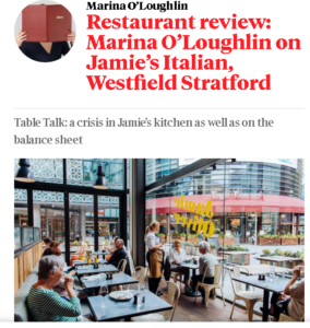 Marina O’Loughlin’s Sunday Times review of Jamie’s Italian at Westfield Stratford starts off badly, with her wanting to “swear and kick something” just looking at the menu, with its “ham-fisted translation… solecisms — pesto made with almonds? “Italian nachos”? … and a rash of adjectives”.