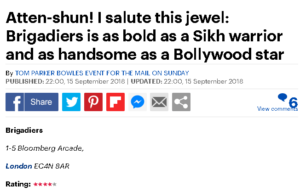 Tom Parker Bowles in The Daily Mail had nothing but praise for Brigadiers. The decor is “exquisitely and expensively wrought, an Indian Art Deco delight of polished marble, lacquered wood and unashamed opulence” and the food has “true culinary integrity but a sly sense of fun” – not surprising for JKS Restaurants, who “create restaurants that never cease to delight”.