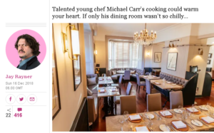 Luckily, Micheal Carr’s cooking won him over, with its “fun ideas”, “enthusiasm” and “admirable risks”. Even the bread was “to be taken seriously”, rich in animal fat and “luscious”. There were distinct moments of “unevenness” – not really acceptable at £55 for three courses.