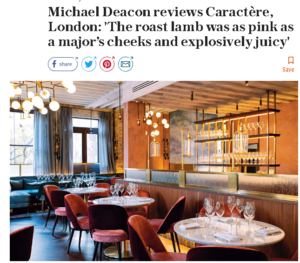 Despite the quirky menu headings (he found the Greedy heading on the puddings list especially off-putting) Michael Deacon for The Telegraph found Caractère “absolutely top-notch”.