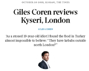 Giles Coren for Saturday’s Times magazine waffled about backpacking through Turkey as a preliminary to his review of Turkish newcomer Kyseri; he’s followed the “blessed hands” of chef Selin Kiazim through her Haggerston pop-up Trip Kitchen and Shoreditch’s Oklava. Her new place is “very Fitzrovia-y as a restaurant, being small, efficiently and prettily designed, full of natural light”, and serves up “wonderfully Turkish” cuisine, with a focus on pasta.