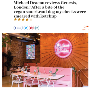 Micheal Deacon in The Telegraph went meat-free and messy this week with a visit to new plant-based restaurant Genesis, where the menu is ” quite something” – and that’s just the design and the Mayan prophecy. he was less surprised by the ” kale mojito, spirulina colada and coffee made from mushrooms”. (****)