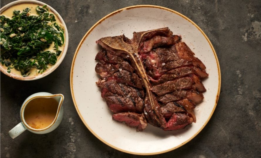 Franklin & Baines offers selection of grass-fed British steaks, dry-aged for a minimum of 28 days, ranging from a 200g hanger steak at £18.50 to a 700g tomahawk for two at £69 – all half-price on Tuesdays. The menu’s US influences include BBQ corn ribs and a chicken Caesar salad.