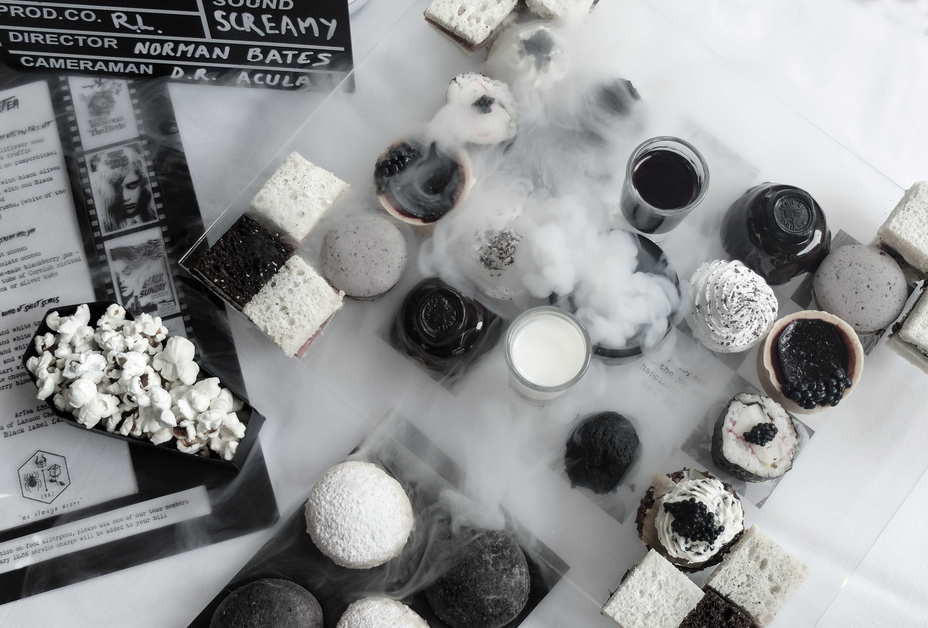On the menu: Axe-Carved Beef with Horseradish; the Ominous Crab Sushi and the Pitch Black Pudding Scotch Egg; Cursed Blackbird Macaroon; Psycho Marbled Lollipops; Black Sunday Battenberg; Night of the Living Tart; a Haunted Panna Cotta; and Chocolate and Coconut Scones, served fresh from the oven with Homemade Blackberry Jam and Clotted-Blood Cream.