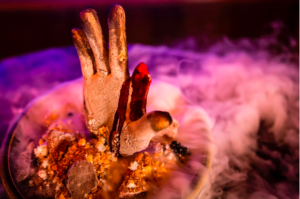 On the menu: ‘Abscess of Prawn’, consisting of prawn carpaccio served over an infected puss of silken tofu, pickled radish and seaweed splattered with smoked red pepper coulis blood; one metre of rare breed pork sausage and creamy parmesan polenta coupled with a side of Israeli couscous, bone marrow bark and edible grubs and mealworms; and vanilla sponge drizzled with edible blood and topped with a severed human chocolate finger.