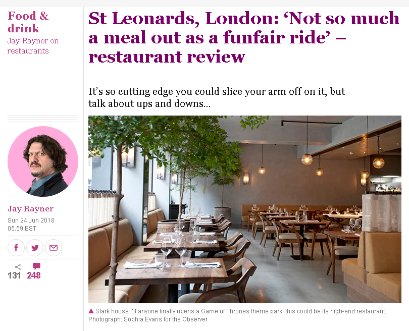 Jay Rayner in The Observer pondered the ” thin line between “That’s genius” and “What in God’s name were they thinking?”” at St Leonards, and declared it perfect for food-obsessed Instagrammers – certainly not a place for those who “want… a relaxing dinner, over unchallenging food”: it’s “so cutting edge you could slice your arm off on it”.
