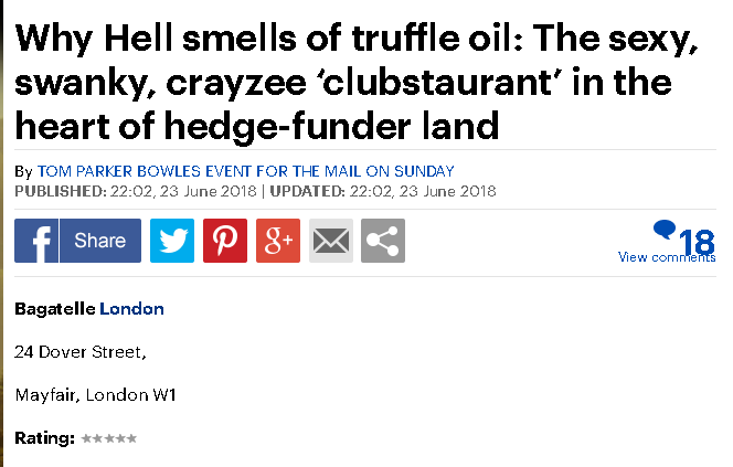 He may have dodged a hellish trip to Bicester Shopping Village last week, but payback came in the form of a zero-star rating (his first ever?) for new Mayfair ‘clubstaurant’ Bagatelle from Tom Parker Bowles in The Daily Mail.