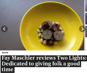 The Evening Standard‘s Fay Maschler is on a roll with being the first critic at London’s hot newcomers – this week she ventured east to Two Lights, the new “Modern American” (or what Fay calls “Modern non-Trump American”) from former Clove Club head chef Chase Lovecky.