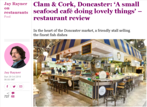 For The Observer, Jay Rayner got nostalgic for the type of indoor town market that “sells both bacon baps and big knickers” – and discovered Clam & Cork in Doncaster’s market, “a small seafood café doing lovely things with the catch that arrives here daily”, with a stainless steel counter surrounding the stall that was formerly a wet fish bar.
