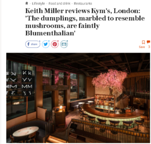 Keith Miller in The Telegraph was one of the latest critics to try out Kym’s, Andrew Wong’s City newcomer – his date was fellow Telegraph critic Kathryn Flett. The “generically tasteful” room is very different to A Wong – and yet the name harks back to the Pimlico restaurant’s original one (his grandmother’s), which “speaks of journeys, homecomings and suchlike”.