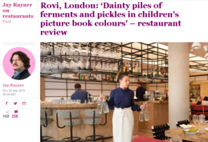 She notes that “finesse and depth of flavour are considerably more pronounced in dishes chosen from the £120 main menu rather than the £70 lunch menu” and that “spontaneity, munificence, emotional connection… are missing in action” (but admits that Michelin cares not a jot for any of those). Clare Smyth’s influences are still evident – will this please the tyre men or will she be the one to steal the stars from her former boss at Core? All will be revealed. (****)