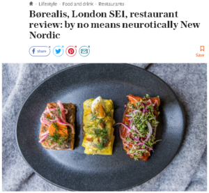 Keith Miller in The Telegraph visited Borealis, a “handsome… high, wide space” located “on the ground floor of a barely completed mixed-use development” with comically low lighting.