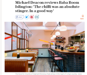 Micheal Deacon in The Telegraph paid a sober visit to kebab restaurant Baba Boom’s second branch, is Islington (“Corbyn country”). One of several restaurants “dedicated to fancy ‘gourmet’ kebabs”, Baba Boom served up oddly sweet starters, a range of kebabs and one dessert option in a “small, plain and unpretentious-looking” restaurant.