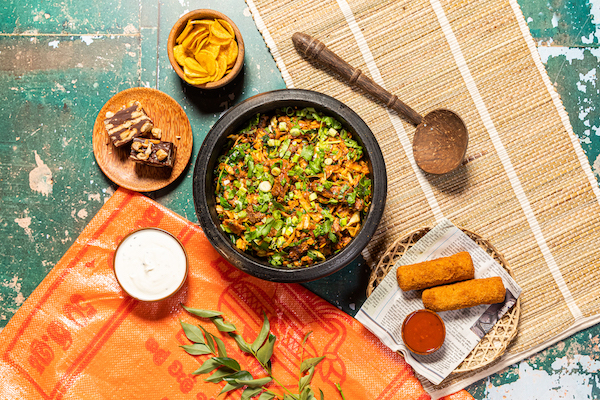 Banana Chips; Vegetable Rolls with Sri Lankan Hot Sauce; Paneer Kothu; Tempered Yoghurt; and Choco-Coco Biskut Pudding
