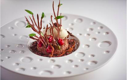 Chestnut veloute, parmesan and sage gnocchi, crispy shallots; Roasted partridge, red cabbage, cranberry, bread sauce; Poached pear Red wine poached pear, almonds, roquefort ice cream.