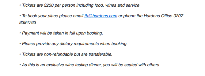 Tickets must be purchased in advance by emailing Tracy Hall th@hardens.com or by phoning the Hardens Office on 0207 8394763 (between 10 – 5, Mon – Fri)