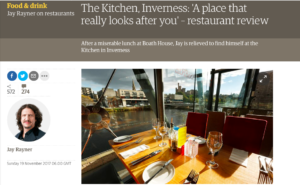 Jay Rayner in The Observer reviews The Kitchen, Inverness (after a bad meal at Boath House, Nairn)… BOATH HOUSE: “I’ve had more fun at the chiropodist, getting my corns removed. I left the Boath House with my will sapped. It is a brilliant opportunity wasted. “A narrow, gummy strip of treacle-cured salmon arrives, with cubes of bitter, […]